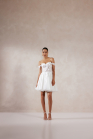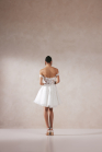 Robe courte de ligne A en dentelle et organza avec décolleté en cœur et bretelles amovibles. Ornée de fleurs en 3D et de dentelle brodée avec des paillettes ton sur ton sur le corsage, les bretelles et la jupe en organza. Le corsage illusion révèle des baleines apparentes et une couche de dentelle Chantilly. Fermeture par boutons jusqu'à la taille et fermeture éclair invisible dans la jupe.
