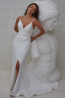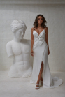 Confectionnée en mikado texturé, la robe Gali dégage une sophistication moderne qu'il est impossible d'ignorer. Le décolleté plongeant en V, orné de délicates bretelles qui tombent gracieusement dans un nœud structuré, est à la fois audacieux et chic, préparant le terrain pour une entrée en scène mémorable.